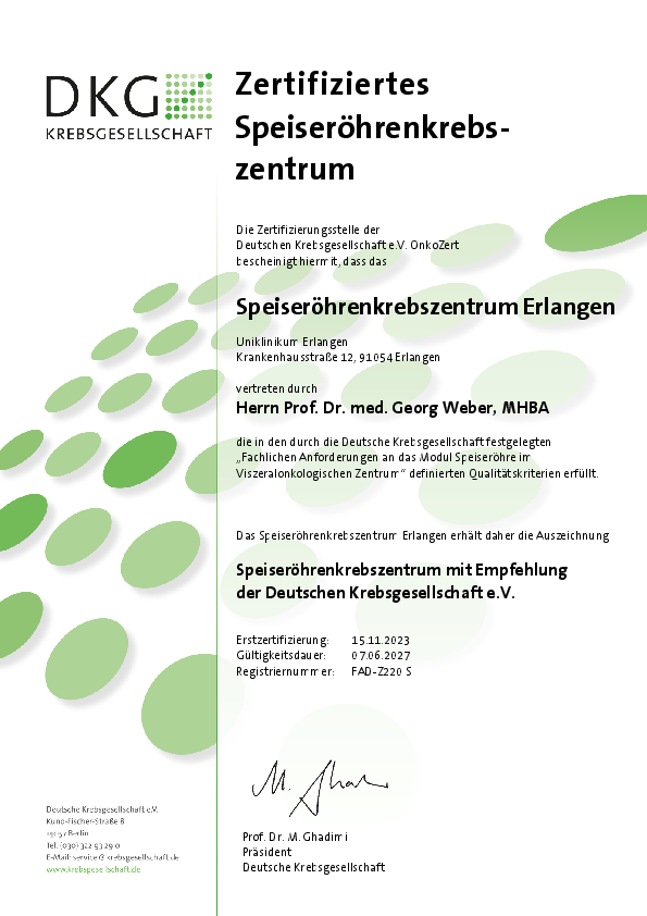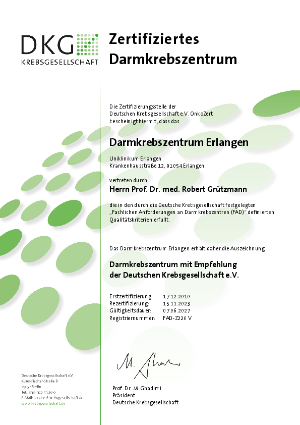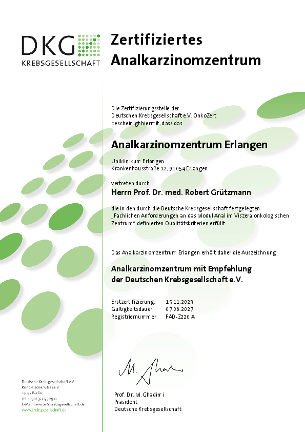 die Chirurgische Klinik ist seit 2023 zertifiziertes Analkarzinomzentrum der Deutschen Krebsgesellschaft. In diesem Zusammenhang werden die Versorgungsqualität und die Versorgungsabläufe von externen Experten bis in alle Einzelheiten geprüft und beurteilt. Unser Ziel ist, die optimale Behandlung sowie die größtmögliche Sicherheit für unsere Patienten zu gewährleisten und uns dabei stetig zu verbessern. Im Rahmen des Qualitätsmanagements überprüfen wir daher ständig unsere Abläufe und Prozesse, sowie die Einhaltung der Vorgaben und Standards mittels interner und externer Audits (DIN EN ISO 9001:2015).